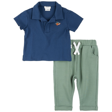 This smart-casual outfit set includes a laid-back polo shirt and coordinating pants with up-turned hems. The pants have an elasticated waistband with a drawstring tie, for a comfortable, all-day fit. Made from the softest materials, the set has the flexibility and breathability he needs to have a great day.