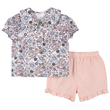 Perfect for tea-parties and picnics, this floral outfit set features a vintage-style shirt with puffed sleeves, a Peter-Pan collar and coordinating pink frilly shorts. With an elasticated waistband, the shorts are easy to pull up and down, encouraging independent dressing, and making diaper changes on the go quick and easy. Theres a matching hat available in the same range, ensuring she looks as cute-as-a-button while being shaded from the sun.