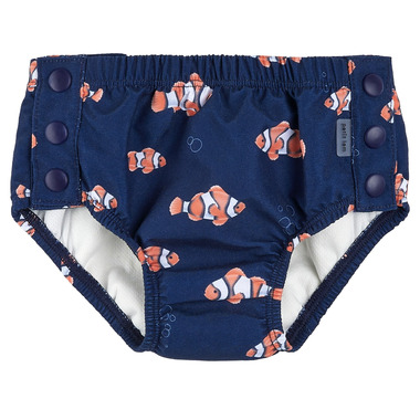 Perfect for splashing around in the paddling pool or playing in the sand at the beach this comfortable swim diaper matches trunks, hats and rompers from the same collection. With a clown fish print, hell love clowning around with the family on vacation. Snap buttons on both sides make it easy to change diapers underneath.