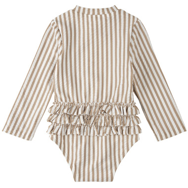 Made for family days by the sea, this taupe stripe, seersucker bodysuit coordinates effortlessly with swimwear available for the whole family. Keeping her comfortable through every giggle and splash, the swimsuit provides full coverage with its long-sleeved design and built-in UPF50+. The front zipper makes dressing quick and fuss-free, so spontaneous dips and sandy adventures are always an option.
