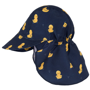 This adorable, navy flap hat with all-over Rubber Ducks print might just persuade your little dude to wear a hat when playing in the sunshine. The fun print matches the swim diaper and romper available in the same range, so he can feel his best from top to toe while mom and dad feel confident knowing hes safe in the sun. The flap hat has a long flap at the back to keep his neck covered during sandcastle sessions or splashing in the water. The visor at the front shades their eyes from the sun and the hat has built-in UPF50+ sun protection. With elastic along the back of the head, the hat sits comfortably all day.