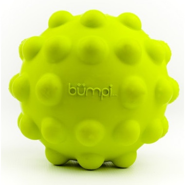 Bumpi has bumps, and loves to roll! This 100% natural rubber dog toy loves to be squished and slobbered on!