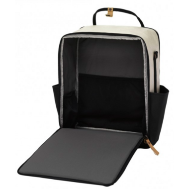 - Zippered, padded compartment at back holds diaper changing items or can carry a laptop