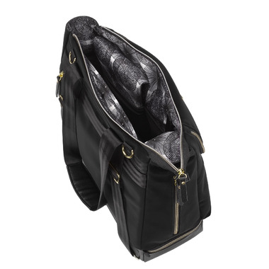 - Insulated front zippered pocket, hidden side bottle pocket and spacious zip-around bottom compartment, all with wipe-able PEVA lining
