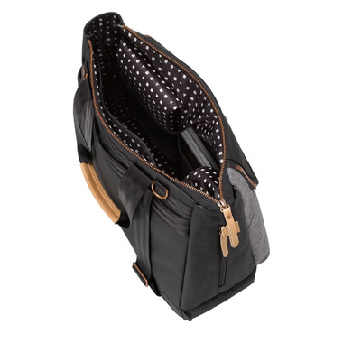 - Insulated front zippered pocket, hidden side bottle pocket and spacious zip-around bottom compartment, all with wipe-able PEVA lining