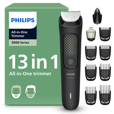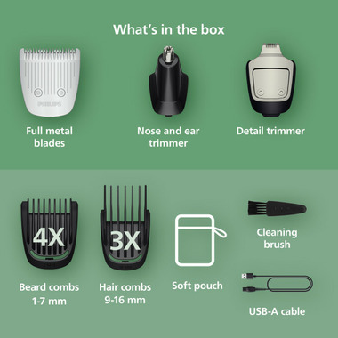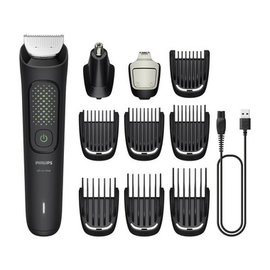 Try out a new look any day of the week with the durable Philips Multigroom 3000 All-in-One hair trimmer for men. With 13 attachments, self-sharpening metal blades for long-lasting precision, and rounded tips for gentler trimming, this versatile and efficient electric razor for men efficiently tackles all your grooming needs. Effortlessly trim and style your beard and hair with precision blades and beard combs that deliver clean, straight lines for your desired look. Use the hair-clipping comb with various length settings to maintain your hairstyle at home. Plus, easily remove unwanted nose and ear hair without nicks or cuts with the nose hair trimmer attachment. This hair and beard trimmer for men features self-sharpening metal blades delivering added strength for maximum precision as you trim, staying as sharp as day 1 with no blade oil required. Select from the 0.5 to 16 mm length settings to craft your desired look to the exact length you want. Experience gentle and comfortable grooming with the unique blade technology featuring rounded tips for a softer touch on your skin. The ergonomic grip allows for easy handling and maneuverability, giving you the comfort and control needed to achieve your ideal look. Built to last, the durable battery offers up to 60 minutes of runtime for uninterrupted trimming. The light indicator shows the battery charging status. With USB-A charging, it's easy to power up anywhere (adapter is not included). The attachments resist bending and the removable heads rinse clean for quick maintenance.