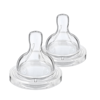 The Philips AVENT Anti-colic nipple flow 3 is a medium flow nipple, which is great for growing babies drinking from a bottle. The anti-colic valve integrated in the nipple is designed to keep air away from your baby's tummy to reduce colic and discomfort. As your baby feeds, the valve flexes to allow air into the bottle to prevent vacuum build up and vents it towards the back of the bottle. It keeps air away from baby’s tummy to help reduce colic and discomfort. The nipple shape allows for a secure latch and the ribbed design helps prevents collapse for uninterrupted, comfortable feeding. The anti-colic nipple is made of flavorless, odorless, soft, silicone that resists discoloring and stickiness, a BPA free material. Philips AVENT Anti-colic nipples are available in different flow rates, to keep up with your baby’s growth. It's recommended to replace nipples every 3 months for hygiene reasons. Use Philips AVENT Anti-colic bottles only with Philips AVENT Anti-colic nipples.