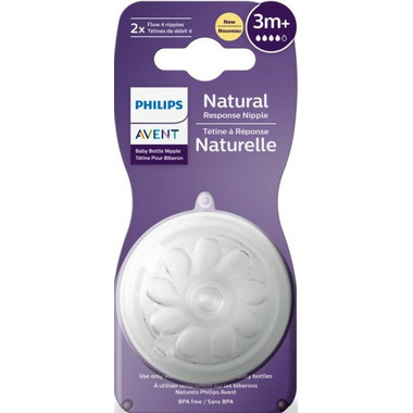 Philips Avent Natural Response nipple lets baby control the pace of the milk, like they do when breastfeeding. The nipples' unique opening and tip only releases milk when your baby actively drinks. When pausing to swallow and breathe no milk flows. Baby can drink, swallow, and breathe using their natural rhythm, just like they do when breastfeeding. Easily combine breast and bottle feeding with a wide breast-shaped nipple with a soft feel that mimics the shape and feel of a breast; plus baby controlling the flow of milk. The nipple has a no-drip design which helps prevent lost milk from the tip. An anti-colic valve integrated into the nipple is designed to reduce colic and discomfort by sending air away from your baby's tummy. The Natural response nipples come in flow rates 1-5, to keep up with your baby's growth. Use Philips Avent Natural bottles only with Philips Avent Natural nipples. Includes: 2 Natural Response nipples, flow 4.