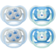 The Philips AVENT SCF085/09 ultra air pacifier for babies 6-18 months is designed with a lightweight, breathable shield for baby's sensitive skin. Four (4) extra large holes in the shield allow for maximum air flow, so skin stays drier while soothing; 84% of moms agree!* 98% of babies accept the nipple**, so you can feel confident with this choice. Comes with 4 pacifiers packaged in 2 sterilizer / carrying cases that can be used to sterilize them with water in the microwave and transport them.