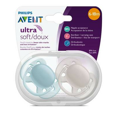 The Philips AVENT ultra soft pacifier for babies 6-18 months is designed with a FlexiFit shield for fewer skin marks and less skin irritation. This makes it a more comfortable choice for baby. 98% of babies accept the nipple. It comes with 4 pacifiers packaged in 2 sterilizer / carrying cases that can be used to sterilize them with water in the microwave.