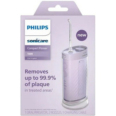 Achieve optimal dental hygiene and oral care with the Philips Sonicare Compact Flosser 1000. This electric water flosser is designed to remove up to 99.9% of plaque* from between your teeth and along your gumline in just 60 seconds. Access hard-to-reach areas with two nozzles that rotate 360 degrees, so that you can use the device in any orientation and reach any corner of your mouth. The N1 Standard nozzle provides a powerful clean between teeth, while the N2 Comfort nozzle with a soft tip has been designed for sensitive gums**. This ergonomic, portable water flosser fits comfortably in your hand, and also in your bag. Its lightweight and compact design makes it easy to maneuver and very handy for travel. When you purchase this product, you receive one purple Philips water flosser, equipped with the 15-second pacer and three water flossing modes (Pulse, Clean, and Sensitive) to cater to your unique needs. With a slim cordless design and a 14-day battery life, it ensures convenience and flexibility for your oral care routine. This water flosser has an IPX7 water-resistance rating, making it truly bathroom-friendly. This Sonicare water flosser has a collapsible reservoir, making it easy to put away or pack on your next trip. The reservoir holds up to 200 ml/6.8 fl. oz. of water, enough for one complete 60-second clean. You can fill the water reservoir easily in two ways. Either remove the reservoir and fill it up like a glass, or top it up using the filling port near the nozzle attachment. The filling port also doubles up as a place to store your nozzle when the flosser is not in use. The reservoir is easy to clean - just rinse it under the tap. Charge the device easily anytime, anywhere with a USB cable - even using your laptop, if an adapter is not within reach.