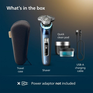 Includes: 1x Shaver i9000 Prestige, 1x Quick Clean Pod, 1x cleaning cartridge, 1x travel case, 1x cleaning brush, 1x USB-A cable; power adaptor not included.