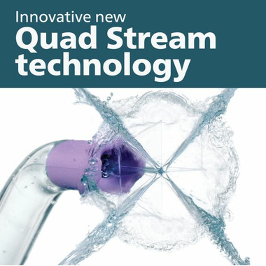 - QUAD STREAM TIP - Creates four wide streams of water for a thorough clean between the teeth and along the gum line.