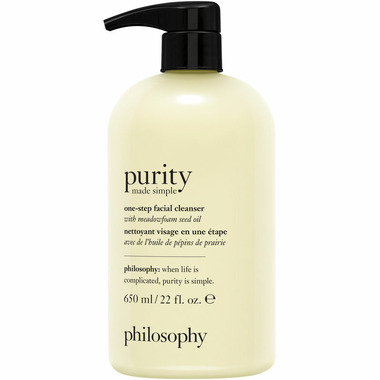 Philosophy's Purity Made Simple One-Step Facial Cleanser with meadowfoam seed oil is an award-winning cleanser that melts away dirt, oil and makeup. It tones and lightly hydrates in one simple step for skin that feels perfectly cleaned and comfortably balanced. Formulated for normal-to-dry skin types and gentle enough for the sensitive eye area, it deep cleans pores while the meadowfoam seed oil extract helps condition skin.