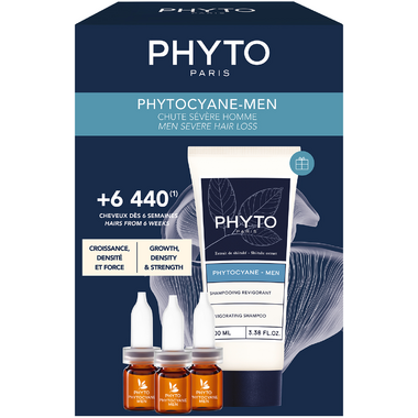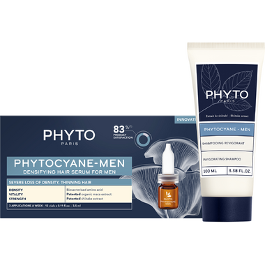 Discover the complete PHYTOCYANE MEN ritual specially formulated for fuller, stronger, and more beautiful hair. This patented innovation combines a powerful concentrate of natural actives with triple efficacy: it slows down hair loss, increases hair density, and promotes visibly healthier hair. Targeting severe progressive hair loss in men due to aging or heredity, this treatment addresses thinning hair in specific areas such as the temples, receding hairline, and crown, persisting for more than six months. With a 95% natural-origin formula, it is enriched with patented maca extract, biovectorised amino acid, and patented shiitak extract. The formula is no-rinse, non-oily, and non-sticky delivering visible results without compromising comfort.