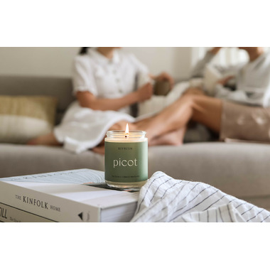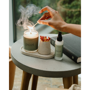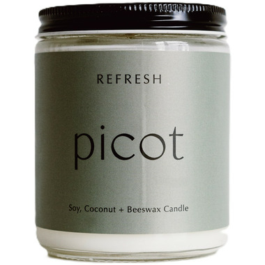 Picot's Refresh scent is a blend of bright blood orange, cooling eucalyptus, and a hint of mint. Together, they create a space that feels energizing and comforting, yet surprisingly warm. It's that crisp, clean, and comforting scent you'll call home.