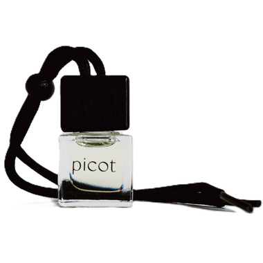 - Picot's glass car diffuser works with a wooden lid and cotton string to pull the scent up from the glass bottle and into the air