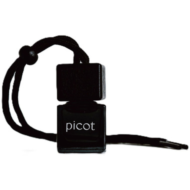 - Picot's glass car diffuser works with a wooden lid and cotton string to pull the scent up from the glass bottle and into the air