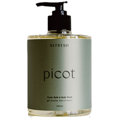 Picot's Refresh Hand, Bath and Body Wash is a blend of bright blood orange, cooling eucalyptus, and a hint of mint. The scent is both energizing and comforting, yet surprisingly warm. It's the scent we supply hotels, gyms, and spas with for their clients. In this way, you can bring the scent of a luxury hotel into your home.