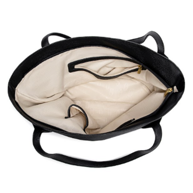 This tote has a soft hand feel with a pebbled texture and oversized handles. It's fit for a business meeting, a day hanging out with friends, or a family dinner.
