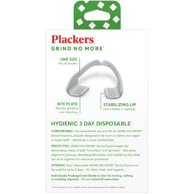 Plackers disposable and ready-to-use night guard can be used for the treatment of bruxism, more commonly known as teeth grinding or clenching. Please consult your dentist before using as a treatment option for bruxism. The streamlined design is one-size-fits-all and can be worn on the upper or lower teeth, whichever is more comfortable: no boiling, cutting, or molding required. The instant fit guards can be used for up to 3 nights and are easily disposable, eliminating stress and providing optimal protection for both "clenchers" and "grinders" alike. With patented bite plate alignment grooves, clench and grind absorbing bite plates, and stabilizing bite plate lips. The Plackers Grind No More Dental Guard works throughout the night to deliver protection, comfort, and peace of mind.