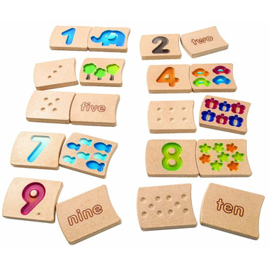 This 20-piece wooden tile set makes learning numbers as easy as 1-2-3! The two-sided tiles feature number 1-10 colorful pictures and words that help children count match spell and trace the numbers. Helps develop Mathematical, Language & Communications, Tactile, and Imagination skills. Ages 2+.