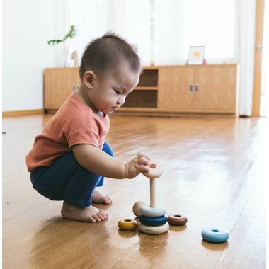 The colourful wooden ring set helps teach children about size and colours. For safety precaution, the center rod is foldable. Sustainably made in Thailand with chemical-free rubberwood trees, formaldehyde-free glues, organic pigments, and water based dyes.