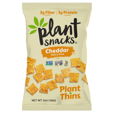 Plant Snacks Plant Thins Cheddar is dairy free. 3g of fibre and 3g of protein per serving.