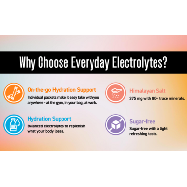 Everyday Electrolytes is your sugar-free solution for healthy electrolyte balance, packed with essential minerals: sodium, potassium, magnesium, and calcium. The raw Himalayan salt provides 80+ trace minerals for optimal health. Designed to go wherever you go, Everyday Electrolytesٙ helps you feel your best all day whether for workouts or daily life.
