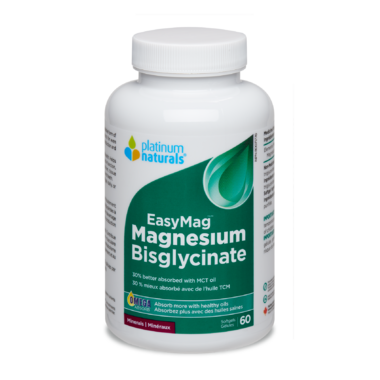 Platinum Naturals EasyMag Magnesium Bisglycinate is this highly bioavailable form of magnesium with medium chain triglycerides (MCTs) from coconut for even greater absorption to help muscle function, energy production and the development of bones.