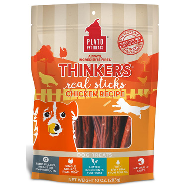 Thinkers Chicken are hearty, meat-packed sticks with added EPA and DHA to support healthy brain function. Made with real chicken as the 1st ingredient, these treats are made with limited ingredients, are naturally preserved, and contain no artificial flavors, corn, wheat, or soy. Because of their large size, Thinkers offer substantial chewing satisfaction or can be broken into smaller pieces to create multiple treats. And Plato Pet takes the extra time to air-dry them in batches in their USA facility instead of baking them in order to retain more of the ingredients inherent nutrients (but your dog will just think that they smell and taste amazing).