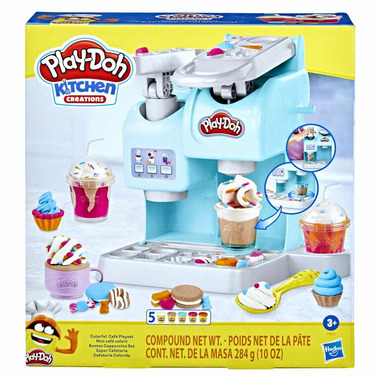 Includes cafe playset, mug, 3 clear frappe cups, 2 frappe cup lids, spoon, and 5 cans of Play-Doh Brand Modeling Compound (net weight 10 oz/284 g).