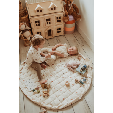 This versatile creation effortlessly transforms into a storage toy bag and a diaper bag, offering you convenience without sacrificing style. With a spacious diameter of 120 cm and made from premium GOTS organic cotton, this playmat not only ensures the comfort of your baby but also reflects a commitment to ethical and sustainable craftsmanship. Blending seamlessly into your daily life, this playmat and diaper bag combination embodies practicality, elegance and the serene charm of birds. For added convenience, the adjustable and removable shoulder strap provides exceptional comfort as you carry the soothing birds design with you. Alternatively, simply attach it to your stroller and set off on new adventures with your little one. Let this beautiful birds design play mat accompany you on a journey filled with exploration, joy and the serene beauty of nature.