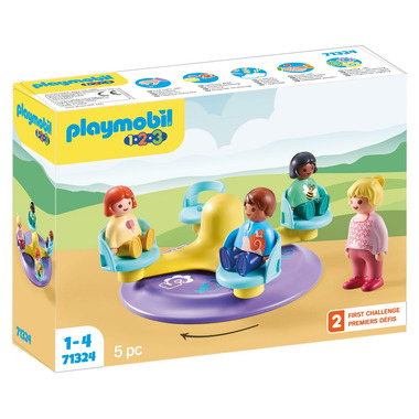 Take a spin on the colorful octopus-shaped Children’s Carousel! With a bright and colorful design and large, rounded pieces, this PLAYMOBIL 1.2.3 set is ideal for toddlers. Up to four figures can take a spin on the fun ride, thanks to the individual seats that rotate without restriction. Turn the carousel by grasping the head of the octopus and giving a strong twist in either direction. Set includes one adult figure, three child figures, and the carousel.