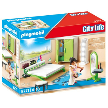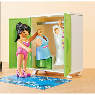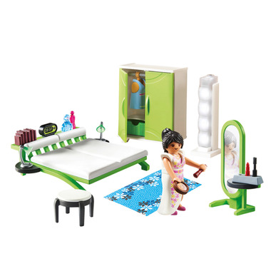 Includes: Figures: 1 woman; Accessories: 1 double bed, 1 wardrobe, 1 light column, 1 carpet, 1 make-up mirror, 1 halterneck dress, 1 dress, 2 coat hangers, 1 stool, 2 table lamps, 1 basket, 1 hair extension ponytail, 1 clock radio, 1 stack of books, 1 lipstick, 1 mascara, 1 powder brush, 1 powder box, 1 bottle, 2 cosmetic bottles