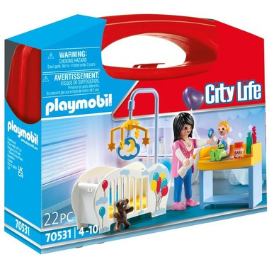 The baby is laughing and growing with the Nursery Carry Case. This take-along carry case has everything needed for the parent to care for the child! Use the bottle for feedings when the little one gets hungry. After some fun with the teddy bear and jingly toy, it's time for nap! The baby snuggles into the crib and watches the mobile above. When playtime is over, pack all the pieces inside the case for easy storage and travel fun.