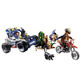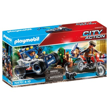 Set includes police officer, bank robber, motocross bike, quad, money, cashbox, bag, gold, tree stump, walkie talkie, and many other accessories. 89 pieces.