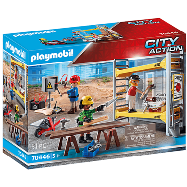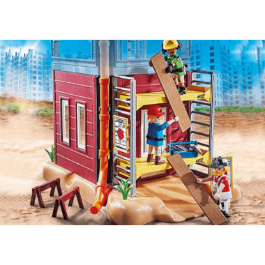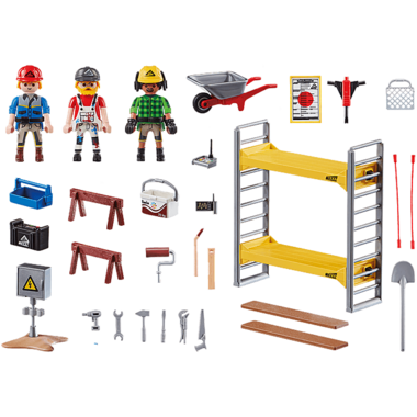 Accessories: 2 scaffolding side parts, 2 scaffolding tracks, 1 fuse box, 1 battery, 1 screwdriver, 2 cables, 1 control unit, 1 brush, 1 paint roller, 1 paint grid, 1 paint bucket, 1 saw, 2 boards, 1 cordless screwdriver, 1 tool box, 1 spirit level, 2 construction helmets, 1 peaked cap