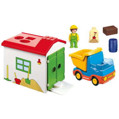 Bring the garbage to the Garage with your Constructions Truck with tilt-able platform. Set includes a figure, construction truck, garage and garbage with a sorting function on the garage roof.