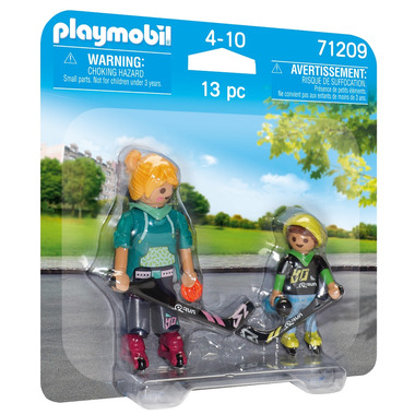 PLAYMOBIL DuoPack Roller Hockey with hockey sticks and pucks. Sporty fun is available with the DuoPack Inline Hockey from PLAYMOBIL. Mother and son slip into the roller skates and deliver an exciting duel for the puck. Who will score the most goals? To cool down with so much sport, a sip from the drinking bottle comes just in time.