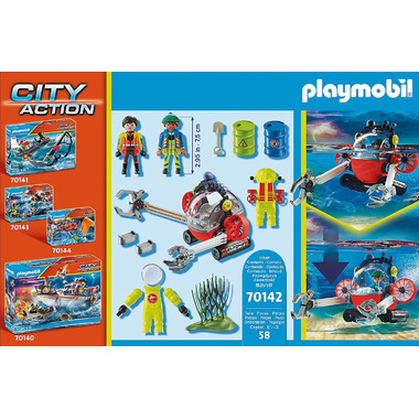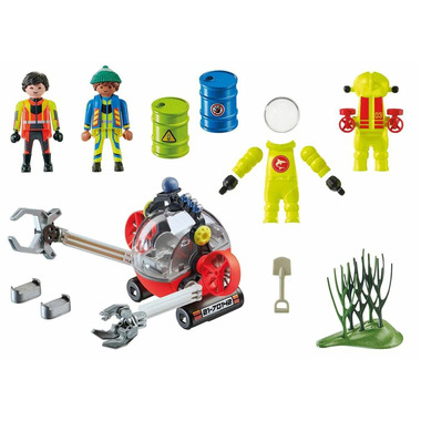 Set includes: Figures: 1 rescue diver, 1 man; Accessories: 1 diving boat with gripping arms, 2 barrels, 1 seaweed element, 1 shovel, 1 diving suit, 1 pair of foot ballast weights, 1 cap, 1 vest