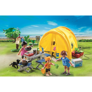 Have some fun in the sun on the Playmobil Family Camping Trip! Sleep in the pop-up tent, and enjoy an outdoor meal on the folding table and chairs. Heat up meals in the pots and pans on the hot plate, and sip on a refreshing beverage from the cooler. Set includes three figures, pop-up tent, foldable table, foldable chairs, cat, clothes hanger with clothes pins, towels, cans of food, cups and plates, lantern and other accessories. The foldable pop-up tent can accommodate a family of four. Combine multiple sets for added fun!
