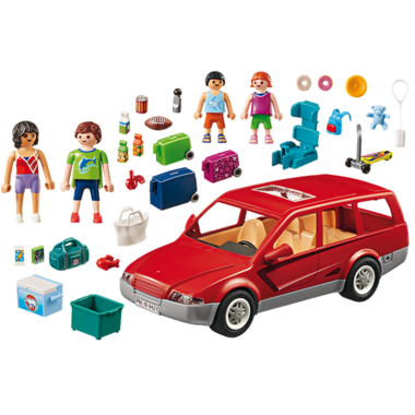 - Two adult figures, two child figures, car, child seats, luggage, food, cooler, backpack, toys, scooter, beach bag, and lots of other accessories.