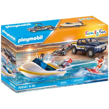 Spend an exciting day on the water with the Pick-Up with Speedboat. When you reach your destination, use the crank to tilt the trailer and lower the boat into the water. Cruise around the lake or enjoy some watersports. Upgrade the boat with the PLAYMOBIL Underwater Motor or the RC Underwater Motor (#7350 or #5536 – each sold separately) for even more adventures.