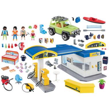 Playmobil Gas Station is for refueling. Car accessories and food for the drive can be bought in the store. Includes an SUV, canoe and many accessories for car care. Can be combined with Playmobil Car Repair Garage (70202)