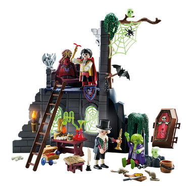 PLAYMOBIL Spooky Fun! Haunted Ruins with three PLAYMOBIL figures, a ruin, a coffin, bats, spiders, and many more extras for thrilling role-playing in the children's room.