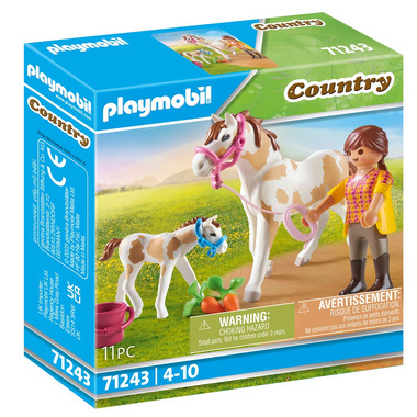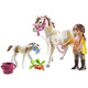 There are still boxes free on the PLAYMOBIL horse farm? Then this horse with foal should definitely move in. The two lovingly designed toy horses invite children to imaginative riding adventures. The set includes a halter with attachable vaulting rope for both horses. This 11-piece playset consists of a PLAYMOBIL figure, a Pinto horse with foal as well as a halter, reins, bucket and carrots. Play with this set on its own or combine it with other PLAYMOBIL Country horse playboxes. Recommended for ages 4 and up.