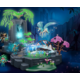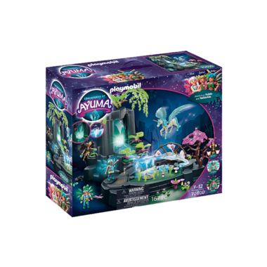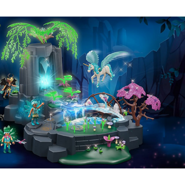 The Magical Energy Source supplies the fairy world with energy. It is guarded by two crystal fairies. The main crystal lights up at the push of a button and a flickering light illuminates the lake. If the water wheel is turned, the plants start to grow, and wafts of mist rise up. Behind the cliff are secret pathways that allow the crystal thieves to slip past the watchful guards unnoticed. The weeping willow and several plants glow in the dark and create an enchanting atmosphere in a children's bedroom at night.