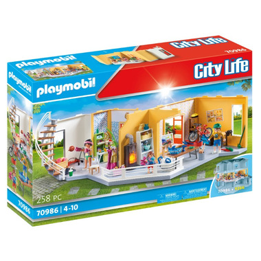 Set includes: two adult figures, a child figure, boxing machine, workbench, bicycle, various fitness equipment and tools, easel, canvas, watercolors, kite, storage cubbies, washing machine, drying rack, ironing board, laundry basket, and many other accessories. Recommended for ages four to ten years.