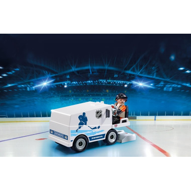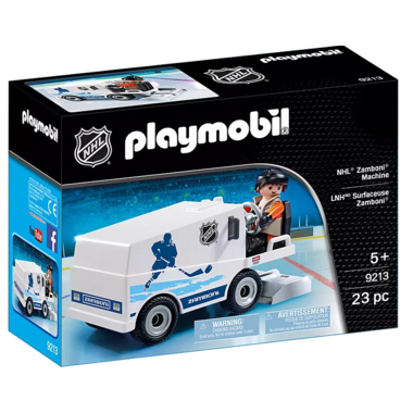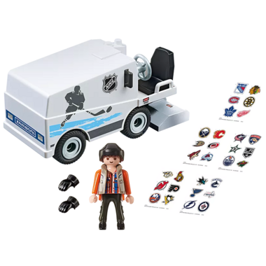 It is the end of the first period and the ice rink needs to be cleaned up! Sounds like a job for the Playmobil NHL Zamboni Machine. Resurface the ice and make sure the players can skate freely. Includes one figure, one Zamboni Machine, and NHL team logo stickers. Combine multiple sets for added fun!
